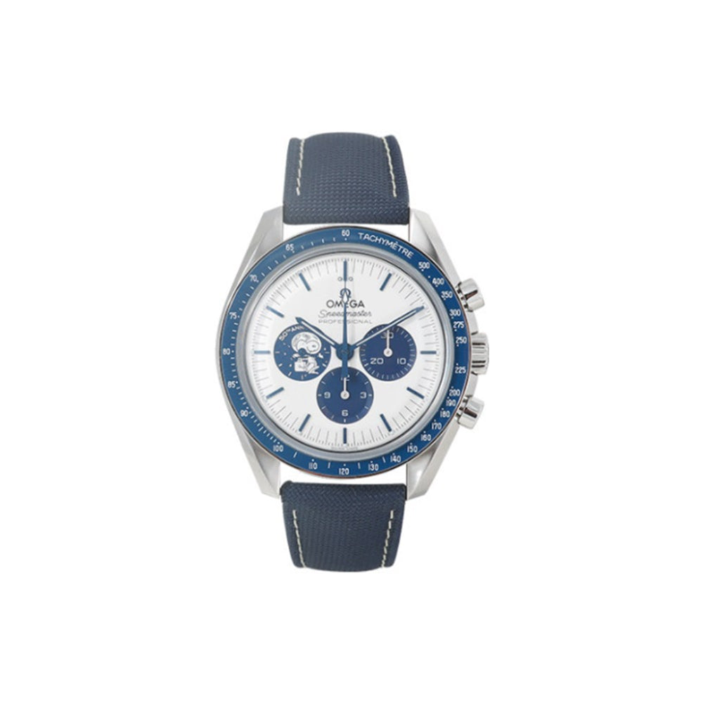 오메가 스피드마스터 실버 스누피 어워드 50주년 시리즈 코 액시얼 크로노미터 크로노그래프 스틸 실버 블루