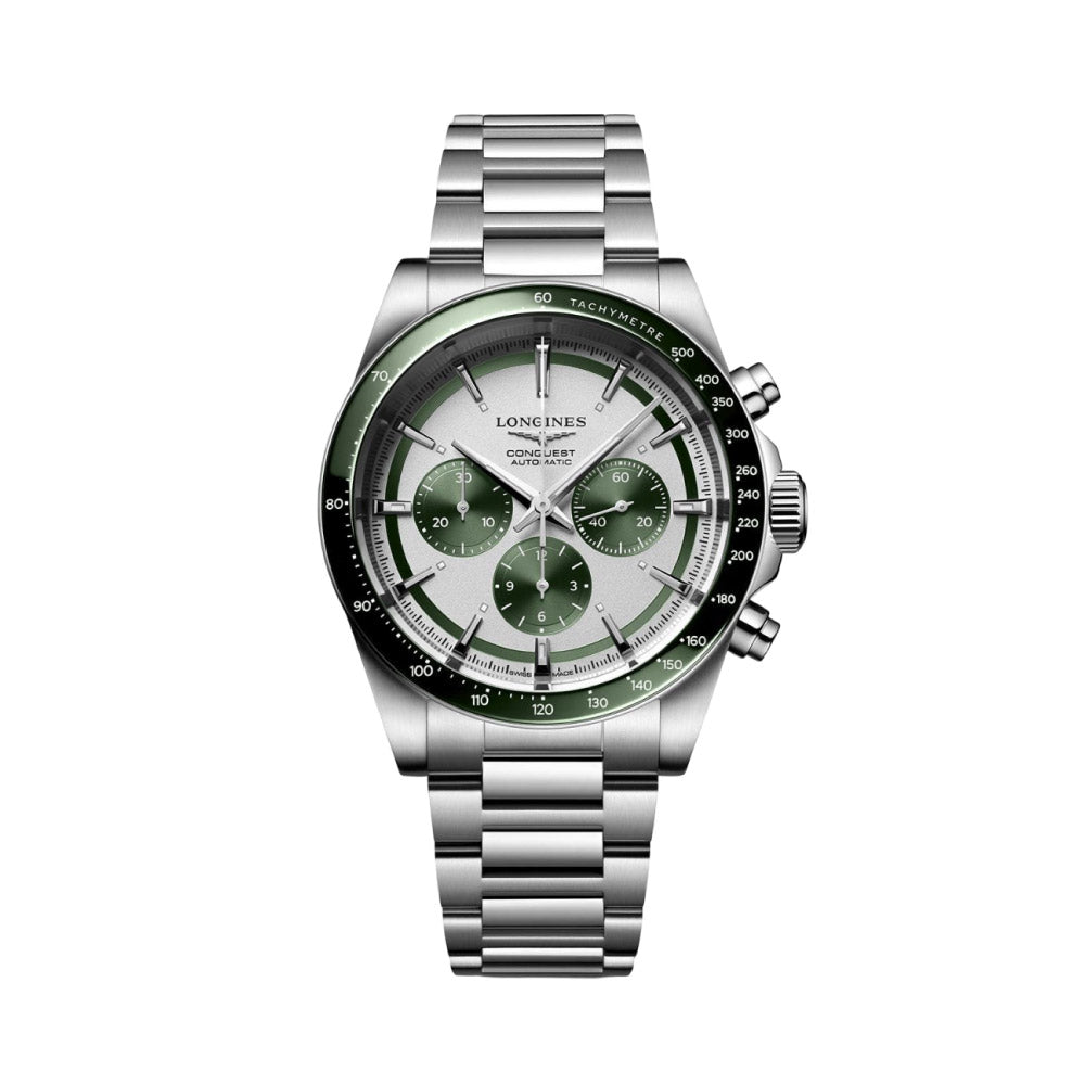 론진 콘퀘스트 크로노그래프 오토메틱 42 실버 다이얼 그린 베젤